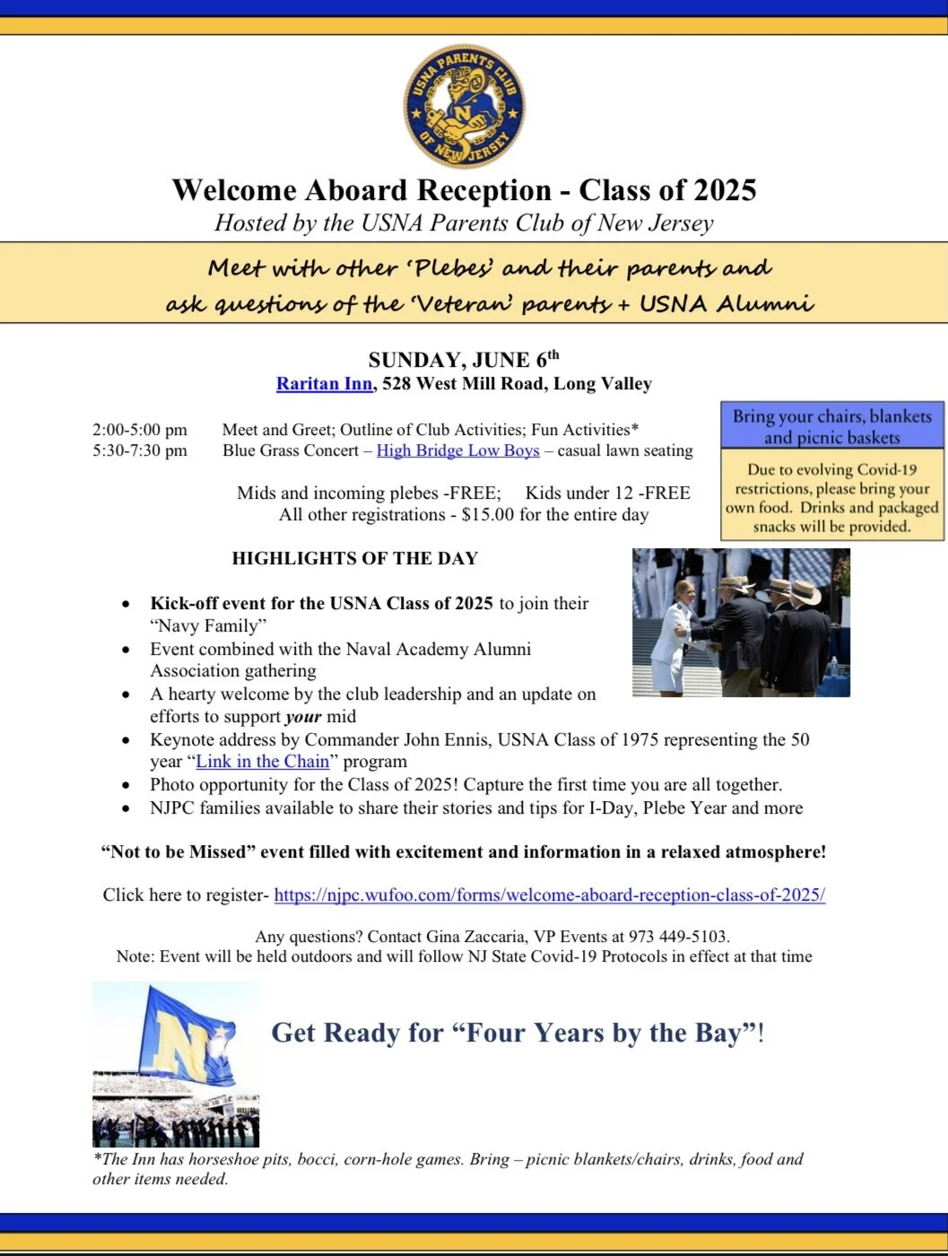 Come welcome incoming plebes and new members and catch up with old friends. We have an exciting day planned with both traditional components and unique surprises. You will have the opportuinty meet veteran families and ask questions, get to know other plebe families from New Jersey and hear the perspectives of various alumni as you are welcomed into the Navy family.