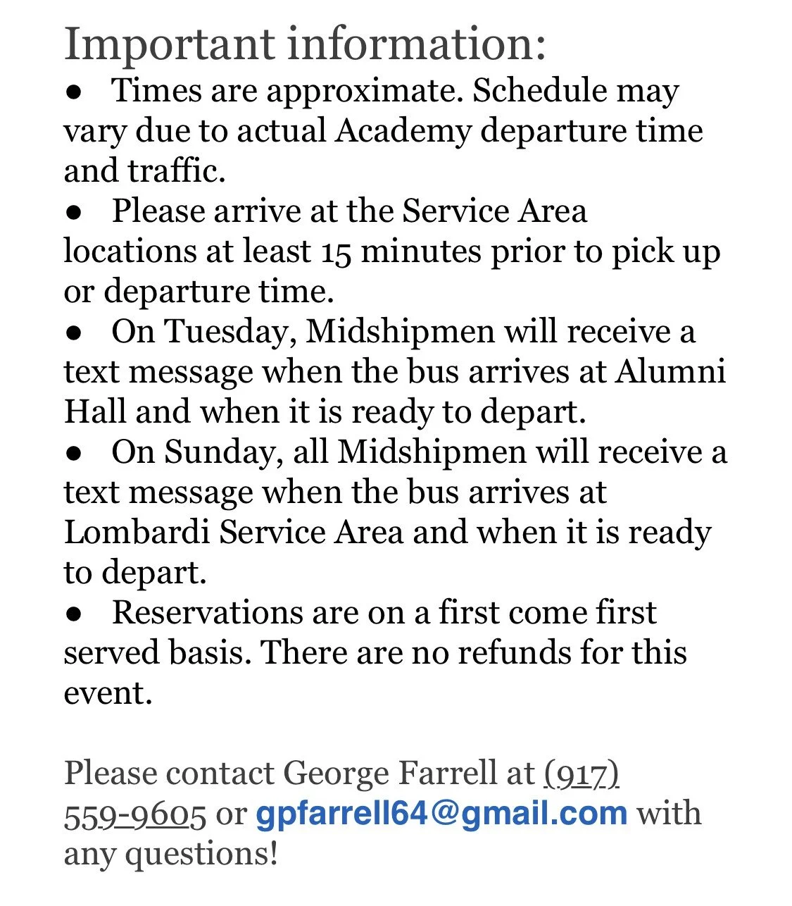 ● On Sunday, all Midshipmen will receive a text message when the bus arrives at Lombardi Service Area and when it is ready to depart.